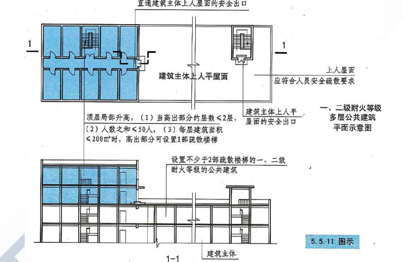 (3)一、二级耐火等级多层公共建筑,当设置不少于2部疏散楼梯且顶层局部升高层数不超过2层、人数之和不超过50人、每层建筑面积不大于200㎡时,该局部高出部位可设置一部与下部主体建筑楼梯间直接连通的疏散楼梯,但至少应另设置一个直通主体建筑上人平屋面的安全出口,该上人屋面应符合人员安全疏散要求。